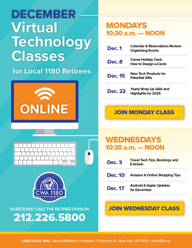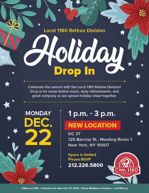 Celebrate the season with the Local 1180 Retiree Division! Drop in for some festive music, tasty refreshments, and great company as we spread holiday cheer together.